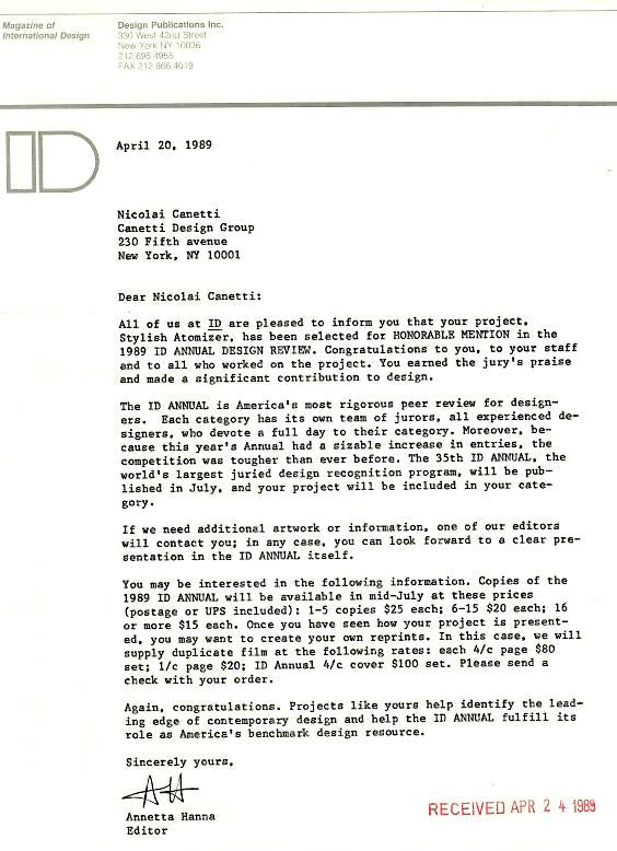 1989: Industrial Design Magazine Special Mention to Nicolai Canetti