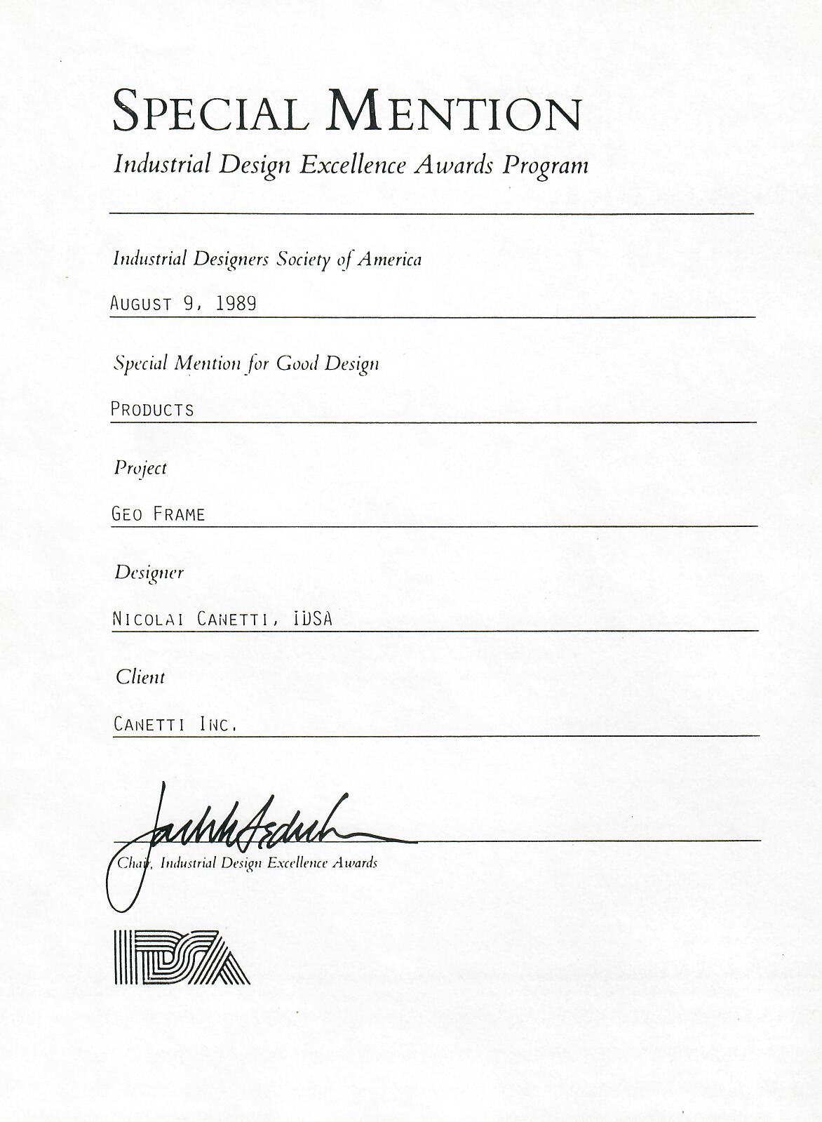 1989: Industrial Designers Society of America, Special Mention for GEO FRAME by Nicolai Canetti