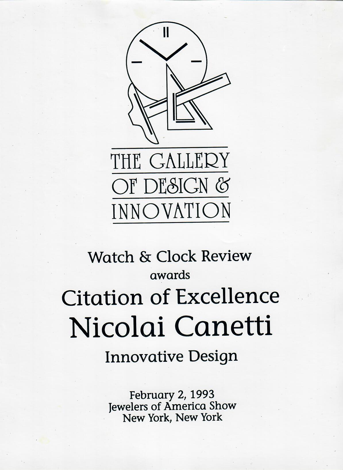 1993: The Gallery of Design & Innovation, Citation of Excellence to Nicolai Canetti