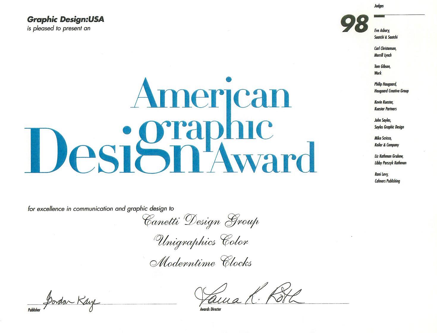 1998: American Graphic Design Award to Canetti Design Group, Unigraphics Color, Moderntime Clocks