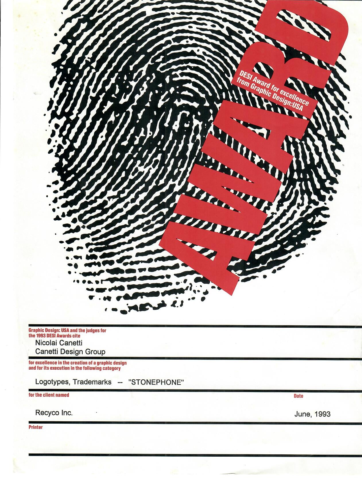 1993: Desi Award for Graphic Design to Nicolai Canetti, Canetti Design Group for "STONEPHONE"