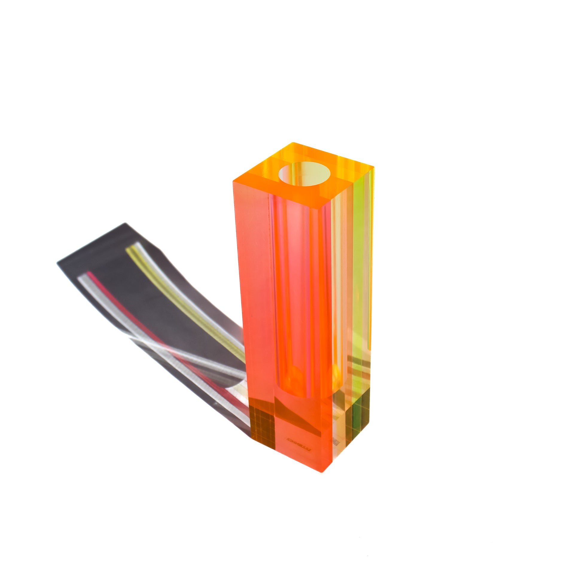 CANETTI exclusive acrylic lifestyle designs are made from a proprietary manufacturing process combining colored acrylic layers to create beautiful color combinations. Pair this vase with the full collection including Round and Square acrylic napkin rings, and  3 Piece Magnetic Tealight Candle Holders.